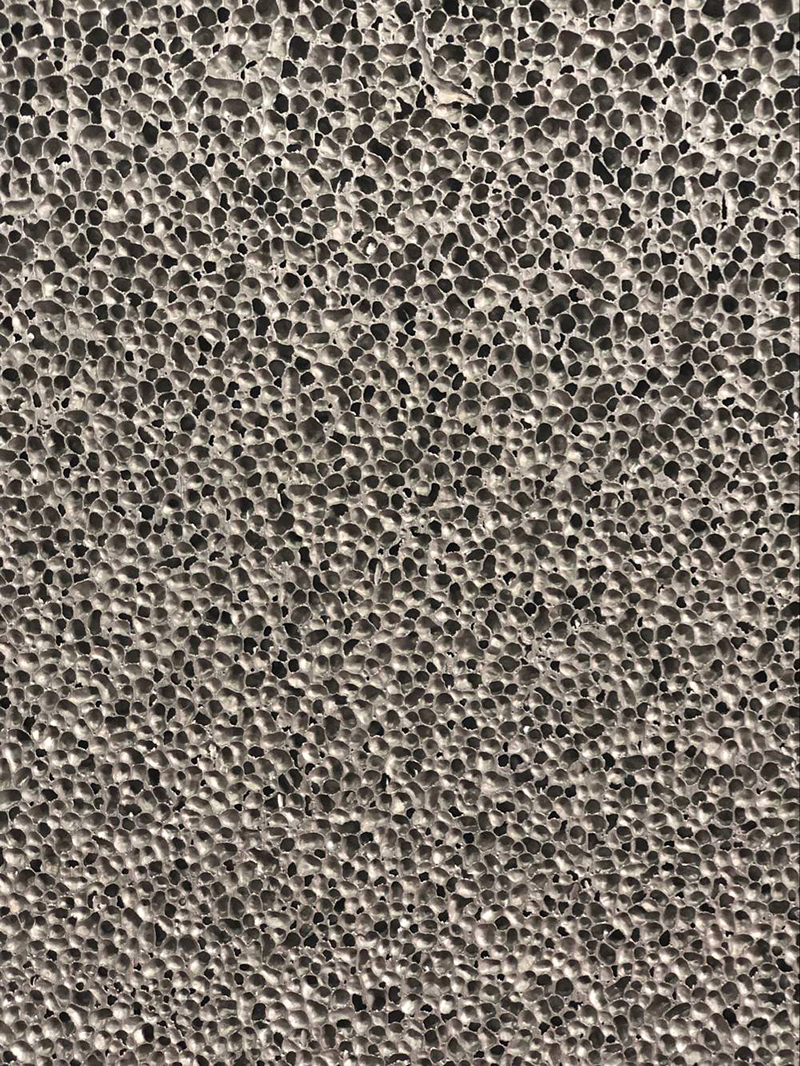 發泡鋁是以氫化鈦為增粘劑和發泡劑,加入熔融的鋁中攪拌而制成的。是一種集結構-性能一體化的新型功能材料,內部是有許多的氣泡層形成的新概念金屬材料一般用金屬做的多孔性材料,它是比重2.7的金屬鋁發泡而成比重只有0.2-0.4的超輕純金屬材料,體積擴大了13倍,重量只相當于木材的三分之一。和開孔泡沫鋁相對閉孔發泡鋁沒有吸聲性能,但是其也有非常良好的吸能及電子屏蔽電磁波的作用,這些特性使它在軍事,火車,輪船,建筑等領域受到廣泛重視。
